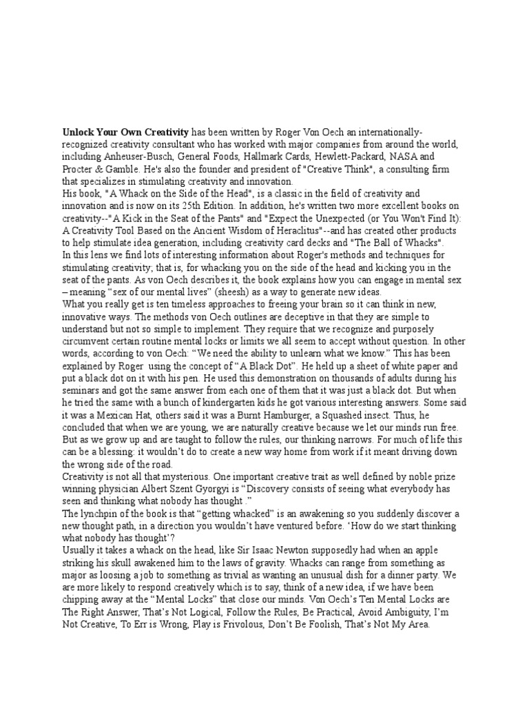 Unlock Your Own Creativity By Roger Von Oech Summary : “in his wonderful book, a whack around the side with the head (nonetheless a single belonging to the seminal books about creativity), roger von oech talks about the concept of looking with the second proper remedy.
